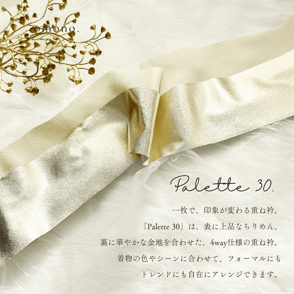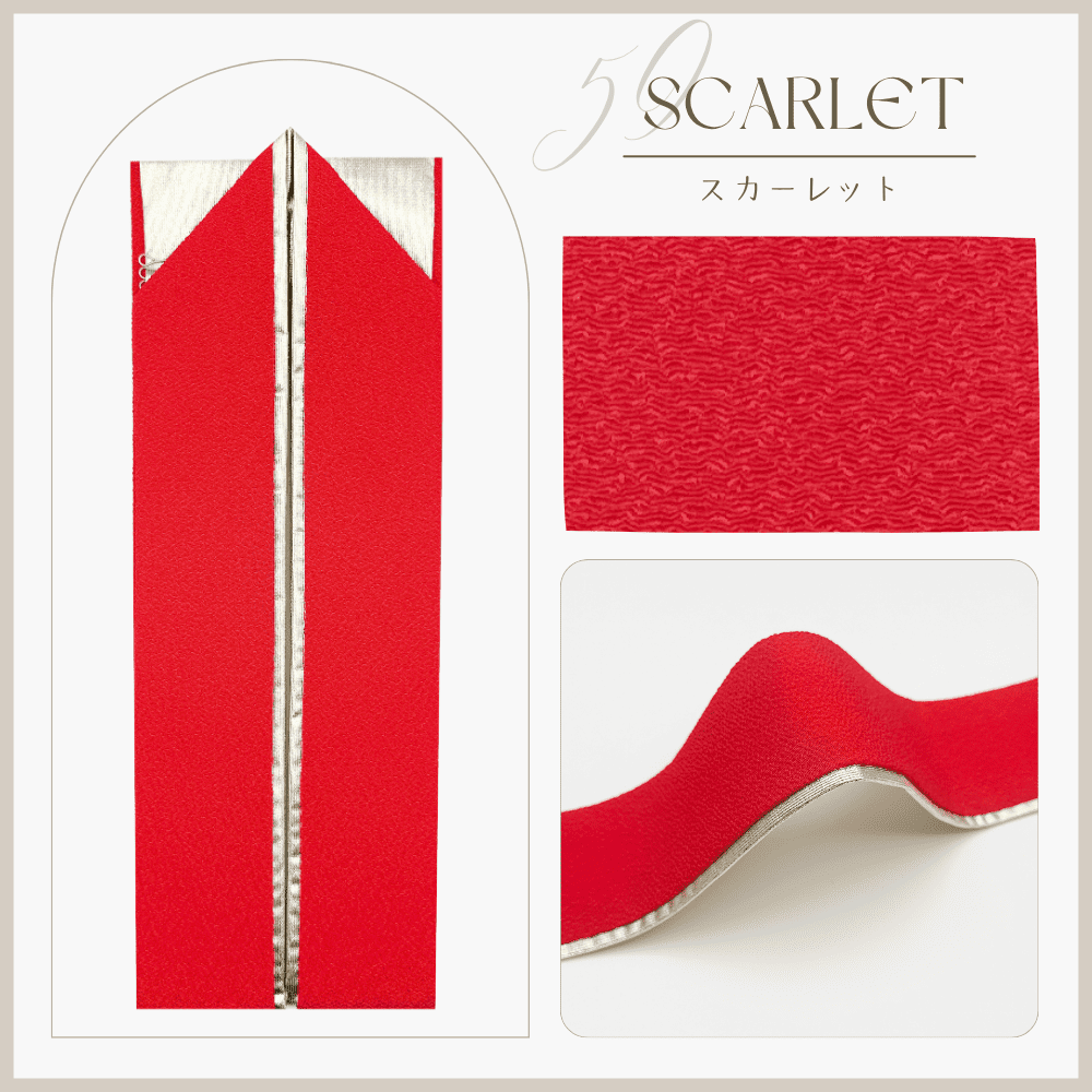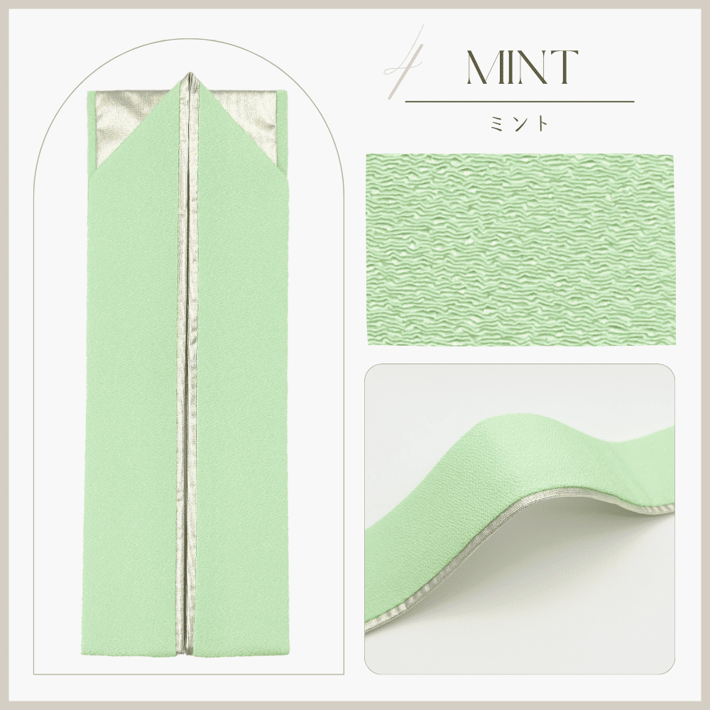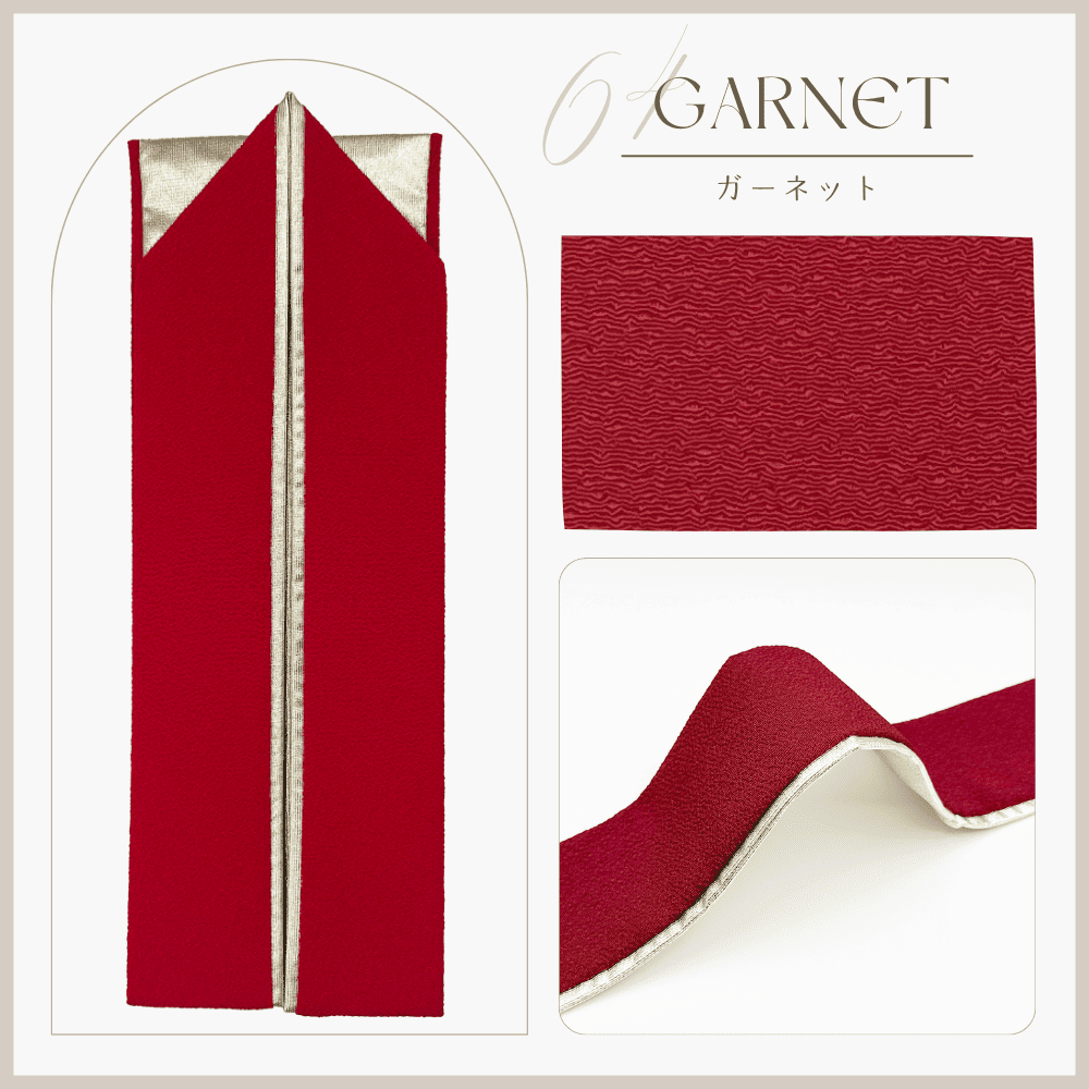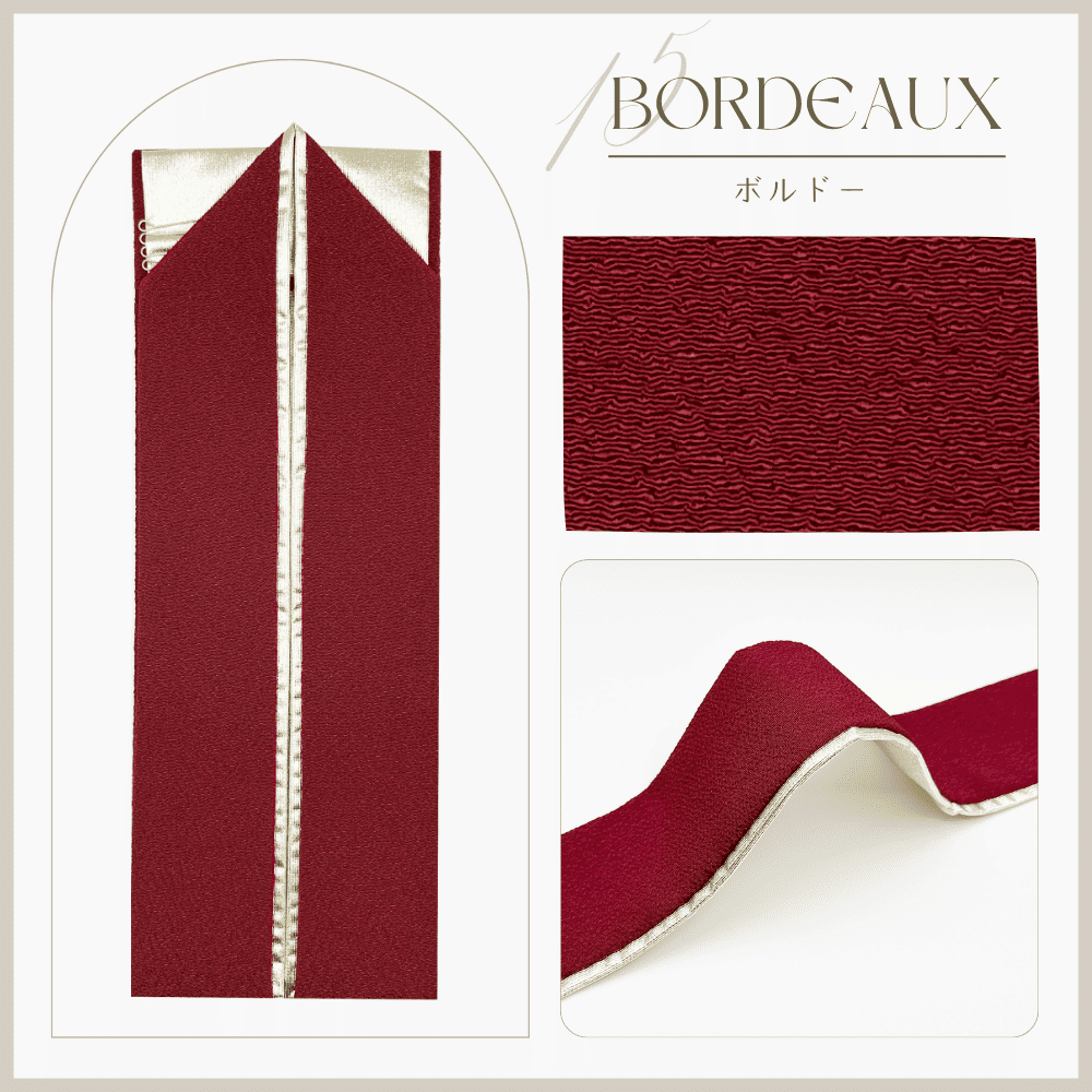 1本で4WAYの使い方ができるリバーシブル重ね衿。振袖・袴・訪問着・留袖・色無地・小紋などフォーマル〜カジュアルで幅広く活躍する日本製ちりめんの重ね衿です。全30色展開(暖色/寒色/モノトーン)。晴れの日の写真映えを意識した差し色から、上品なモノトーンまで揃えています。